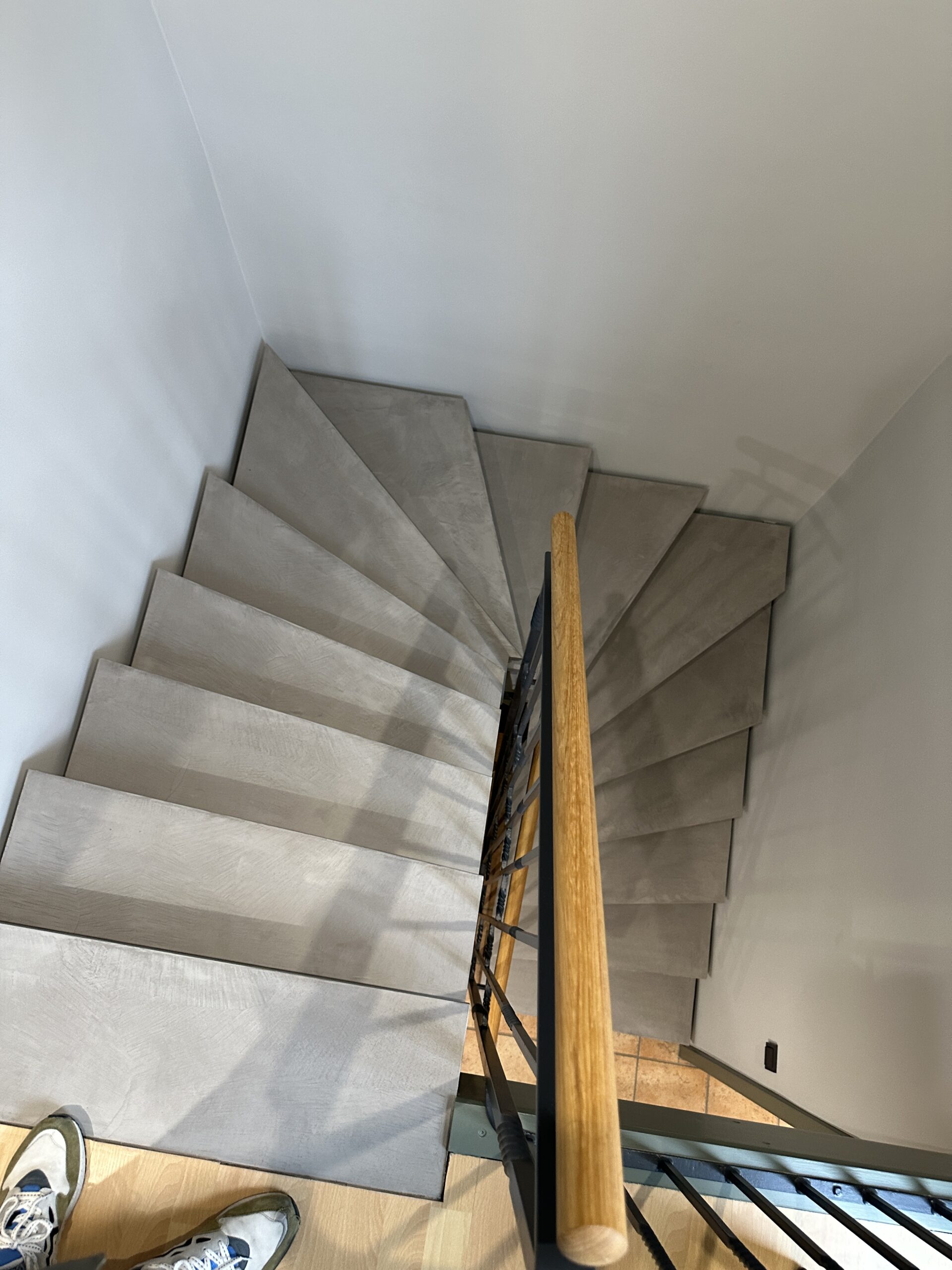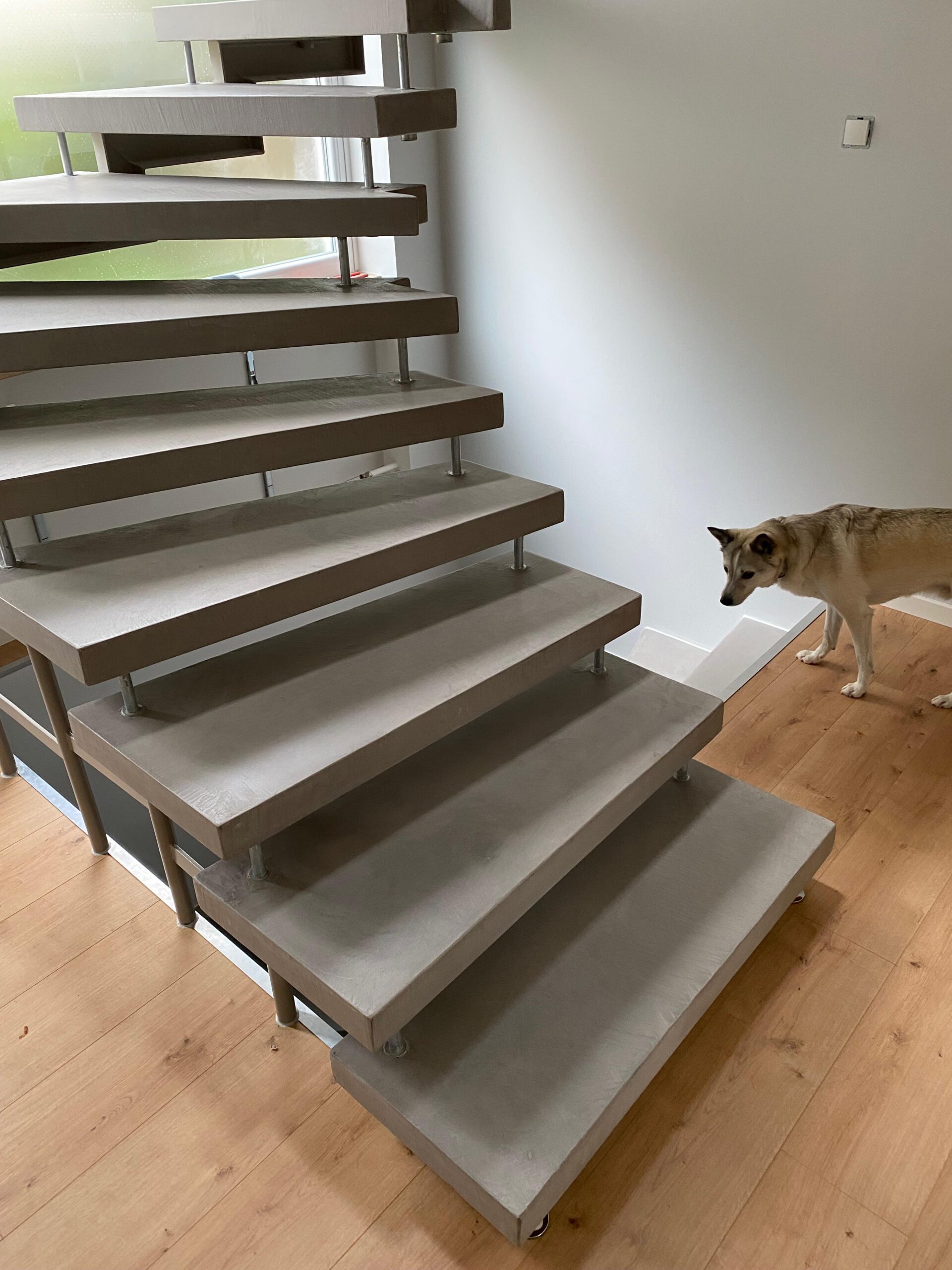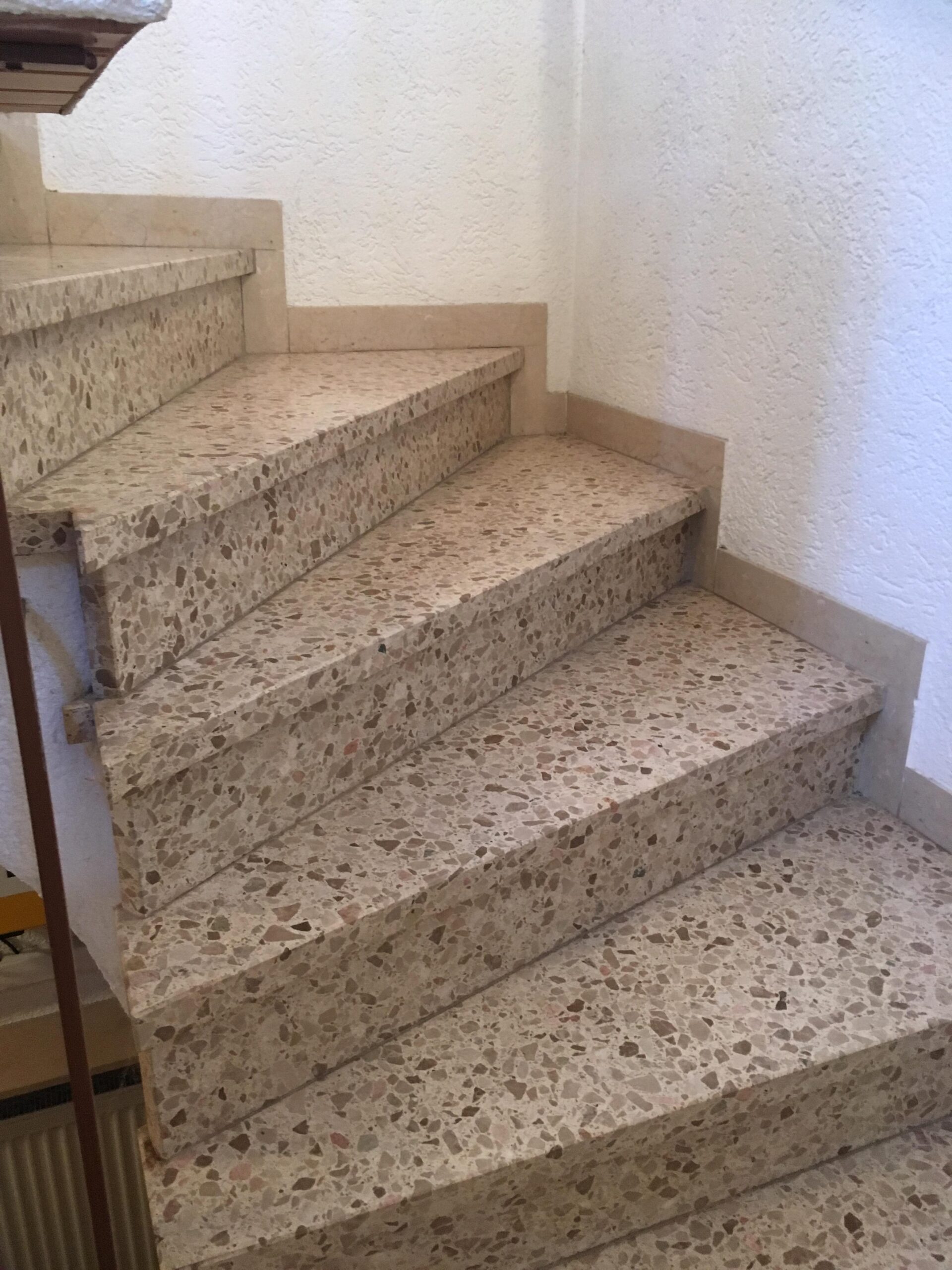 Durch Schleifen und Verdichten entsteht eine gleichmäßige, edle Oberfläche. Zum Abschluss wird die Treppe mit einer widerstandsfähigen Versiegelung geschützt, die sie langlebig und pflegeleicht macht.